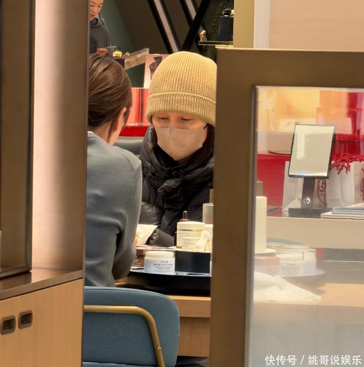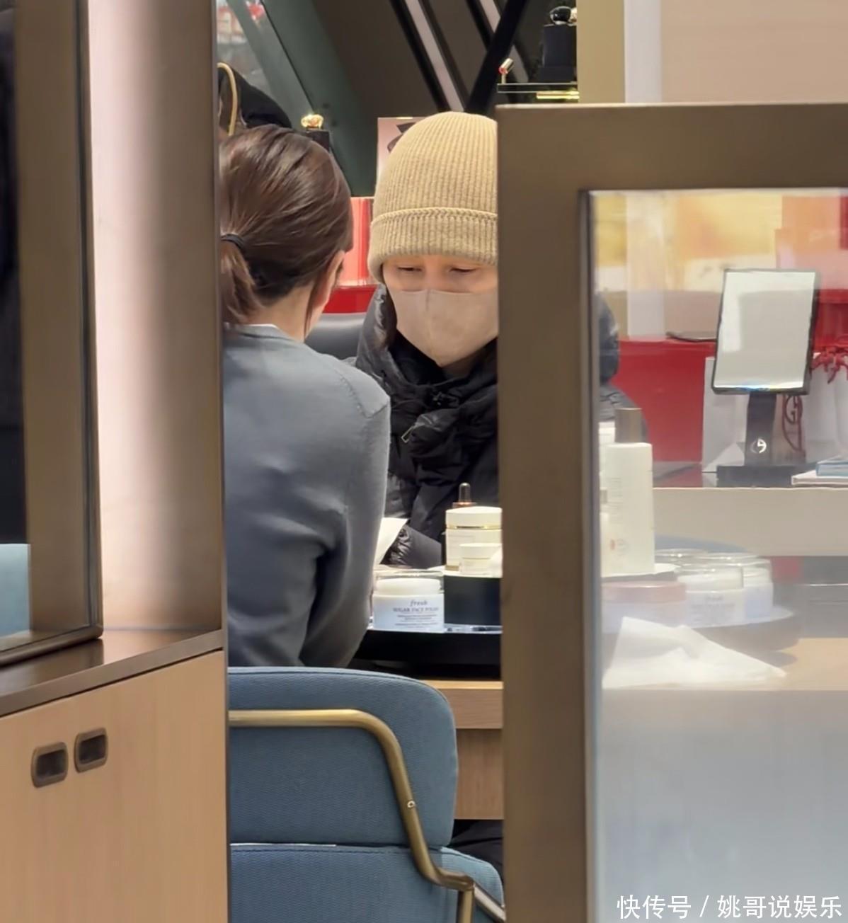 只见袁泉穿着黑色的羽绒服,正在认真的听讲着销售小姐姐的介绍,袁泉应该是到商场去买护肤品了!